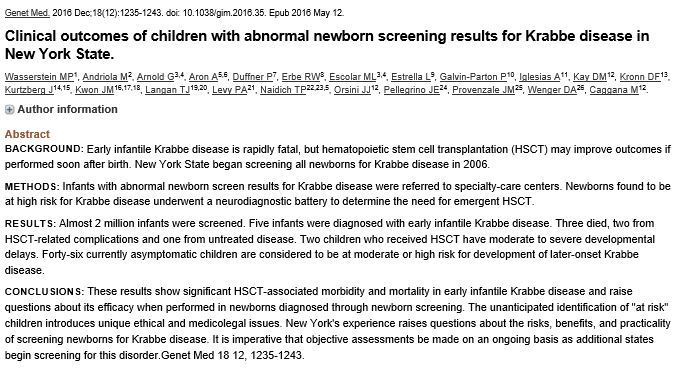 Wasserstein, M. P., Andriola, M., Arnold, G., Aron, A., Duffner, P., Erbe, R. W., Escolar, M. L., Estrella, L., Galvin-Parton, P., Iglesias, A., Kay, D. M., Kronn, D. F., Kurtzberg, J., Kwon, J. M., Langan, T. J., Levy, P. A., Naidich, T. P., Orsini, J. J., Pellegrino, J. E., Provenzale, J. M., … Caggana, M. (2016). Clinical outcomes of children with abnormal newborn screening results for Krabbe disease in New York State. Genetics in Medicine: Official Journal of the American College of Medical Genetics, 18(12), 1235–1243. https://doi.org/10.1038/gim.2016.35