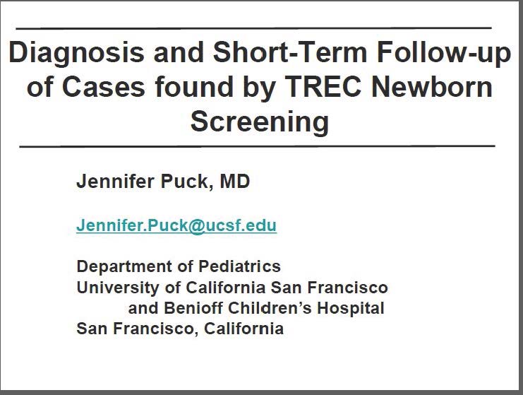 Dr. Jennifer Puck, University of San Francisco and Benioff Children's Hospital, provided a clincal overview of Severe Combined Immunodeficiency (SCID) and discussed the importance of SCID newborn screening and the benefits of long-term follow-up data.