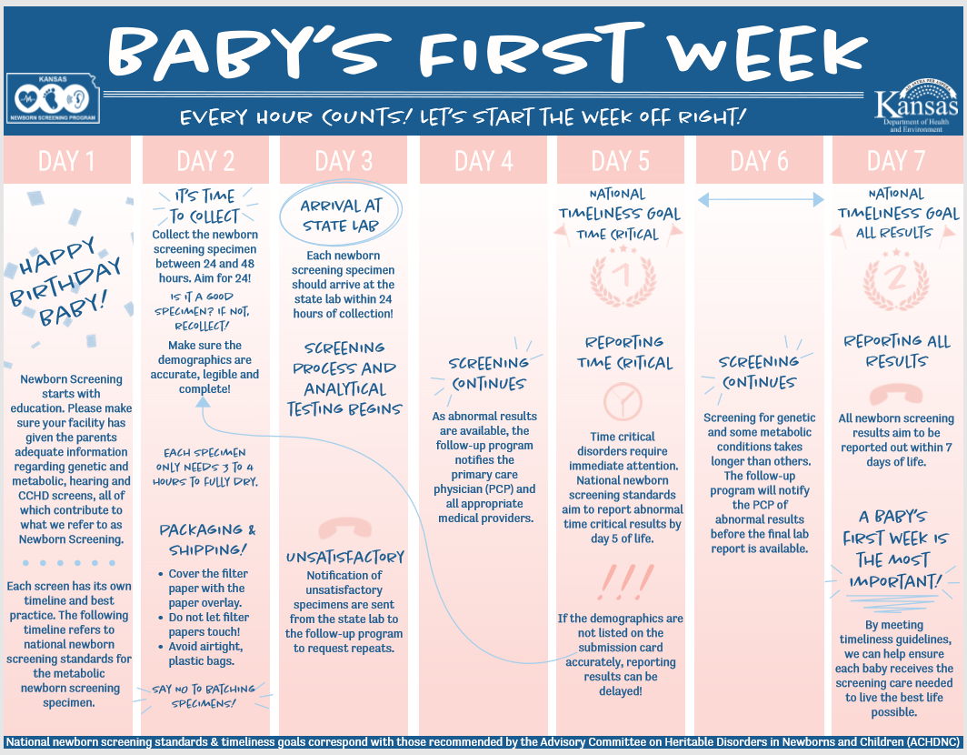 This resource was created by the Kansas Newborn Screening Program to educate stakeholders on the entire process and expected timeline of NBS dried blood spot. It depicts the goal of newborn screening for every child screened, particularly in a low risk environment. Often stakeholders are involved primarily in only one aspect of NBS (i.e. collection, testing, reporting results, diagnostic evaluation) and hope that this tool will aid in depicting how important and valuable every aspect of newborn screening is from education, timely collection and shipment to reporting out of results and diagnostic evaluations.