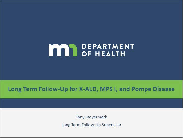This is a presentation provided by the Minnesota Department of Health during the new disorders meeting in June, 2017, describing long-term follow-up for X-ALD, MPS I and Pompe Disease.