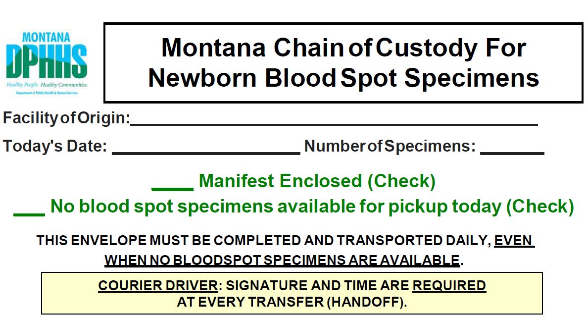 This chain of custody form helped the Montana Newborn Screening Program better track the transfer of specimens from the submitter through delivery at the laboratory.