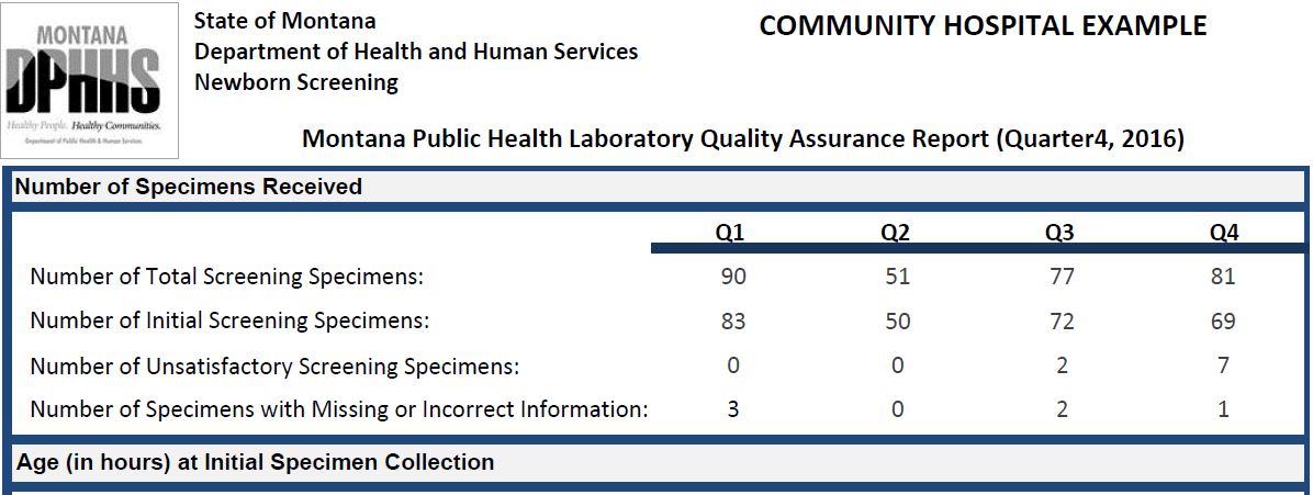 This is an example of a quality assurance report that is shared with submitters in Montana. It covers the number of unsatisfactory screening specimens, the number of specimens with missing or incorrect information and timeliness metrics. Additionally, it is attached to an informative sheet that provides more information about why these metrics are important and how they play a role in the health outcome of a baby.