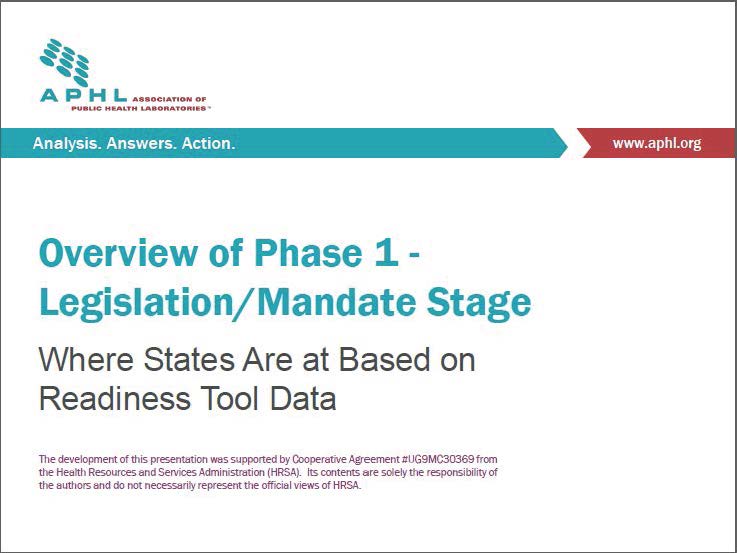 This presentation during the new disorders meeting in June, 2017 provides an overview of where states are in regard to phase 1 legislation activities, and outlines technical assistance provided by APHL's public policy team.