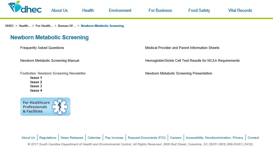The Newborn Metabolic Division in the South Carolina Department of Health and Environmental Control has developed a manual for newborn screening (NBS) that outlines the procedures of daily activities related to their program. They have also developed NBS information sheets for parents and providers.