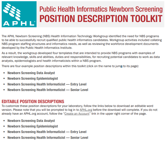 The APHL NBS Health Information Technology (HIT) Workgroup identified the need for NBS programs to be able to recruit qualified public health informatics candidates successfully. As a result, there are four editable, example position descriptions within the toolkit.