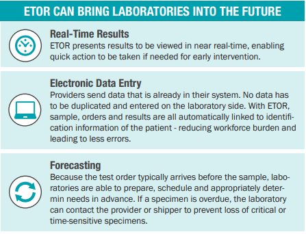 The nation depends on public health laboratories to conduct critical and complex tests to keep our country safe from emergent threats, environmental contaminants, and food-borne illnesses. Accurate data and efficient turn around time for results is crucial. Electronic Test Orders and Results (ETOR) enables laboratories and health care providers to directly exchange standardized test orders and results across different facilities and electronic information systems using agreed upon standards. The sooner laboratories receive and process test orders, the faster they can return results — essential for surveillance, outbreak and public health emergency response and early intervention — leading to better patient care. ETOR is quickly becoming standard protocol across clinical laboratories, and is increasingly being defined as a required business need for providers.