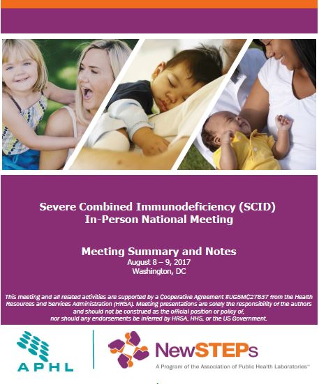This document includes brief summaries of each of the presentations from the National Severe Combined Immunodeficiency (SCID) meeting held in August, 2017, as well as links to many of the presentations. The purpose of this meeting was to convene SCID newborn screening stakeholders and to facilitate the strengthening of relationships between the SCID clinical network and the newborn screening community within each state. During this meeting participants shared solutions for SCID newborn screening implementation in order to support ongoing quality practices, quality data collection and interpretation across the United States. Participants included over 100 representatives from state newborn screening laboratories, follow-up programs, and clinicians, representing 38 states.