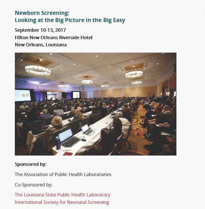The 2017 Newborn Screening and Genetic Testing Symposium will take place in New Orleans, LA on September 10 – 13, 2017 at the Hilton New Orleans Riverside Hotel. This meeting is sponsored by the Association of Public Health Laboratories and co-sponsored by the Louisiana State Public Health Laboratory and the International Society for Neonatal Screening.