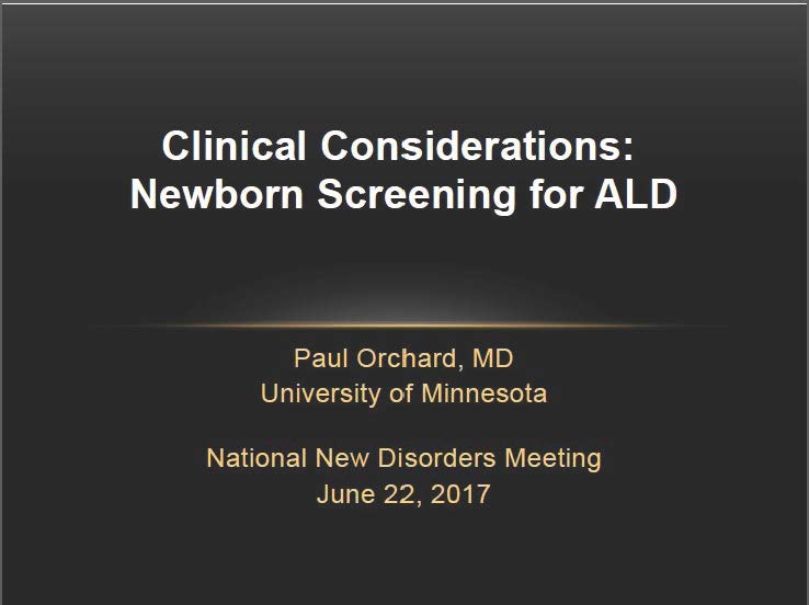 This is a presentation provided by Paul Orchard, MD during the new disorders meeting in June, 2017, describing the clinical considerations for screening for X-Linked Adrenoleukodystrophy (X-ALD).